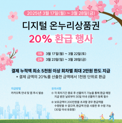 이벤트 기간 동안 디지털 온누리상품권으로 최소 5천 원 이상 결제하면 최대 20% 디지털상품권으로 환급됩니다. (결제금액의 20% 1천원 단위 환급)