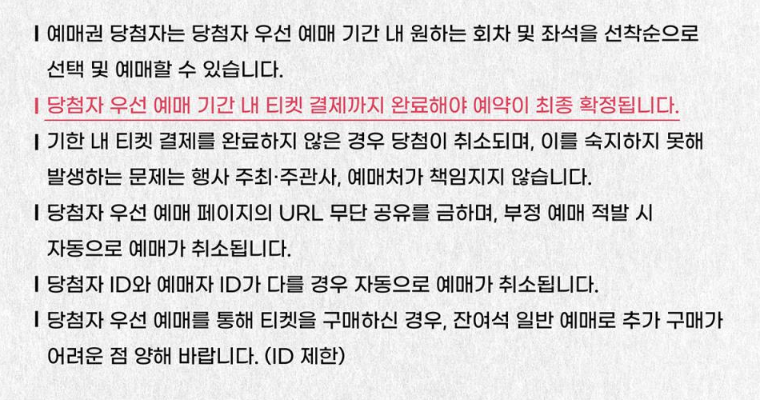 2) 당첨 후 미결제 시 예매 기회는 자동 소멸되며 일반 예매로 전환됩니다.