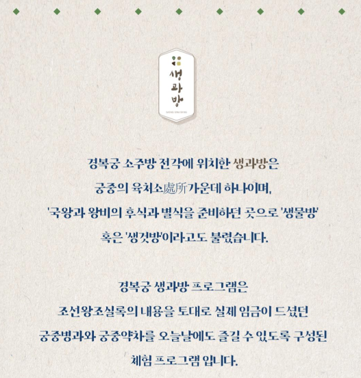 경복궁 생과방 프로그램은 조선왕조실록의 내용을 토대로 실제 임금이 드셨던 궁중병과와 궁중약차를 오늘날에도 즐길 수 있도록 구성된 체험 프로그램입니다.