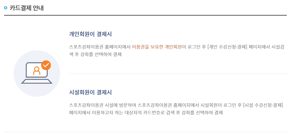 ※ 결제 금액이 10만 5천 원 초과할 경우, 스포츠강좌이용권 카드 계좌에 초과 금액이 남아있어야 결제 가능합니다.