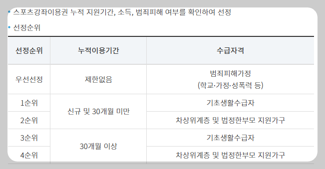 스포츠강좌이용권 선정 기준은 신규 및 이용 기간이 적은 신청자를 우선하며, 수급자격에 따라 아래와 같이 순위가 정해집니다.
