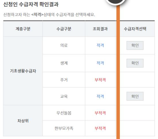 5) 수급자격 조회결과 적격으로 뜬 항목 중 신청하고자 하는 신청인의 수급자격 선택