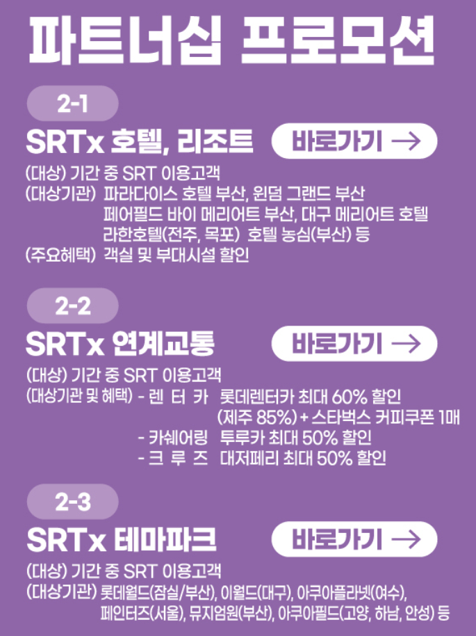 SRT 홈페이지에서 파라다이스 호텔, 라마다프라자 등 파트너십 호텔과 리조트를 확인하시고, 할인 쿠폰 등을 다운로드하여 이용하실 수 있습니다.