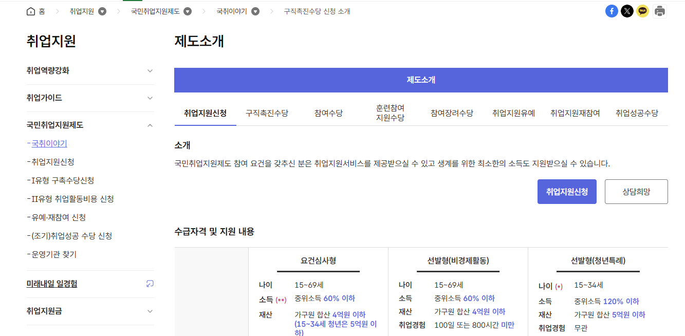 취업에 성공할 수 있도록 직업훈련, 교육, 1:1 컨설팅 등 다양한 지원을 제공하며, 저소득 구직자에게는 월 최대 50만 원 × 6개월의 구직촉진수당까지 제공됩니다.