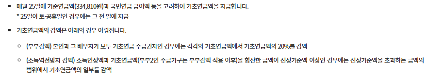 즉, 월 소득과 재산을 일정 기준으로 계산해 나온 금액이 수급 가능 여부와 연금액 결정의 핵심이 됩니다.