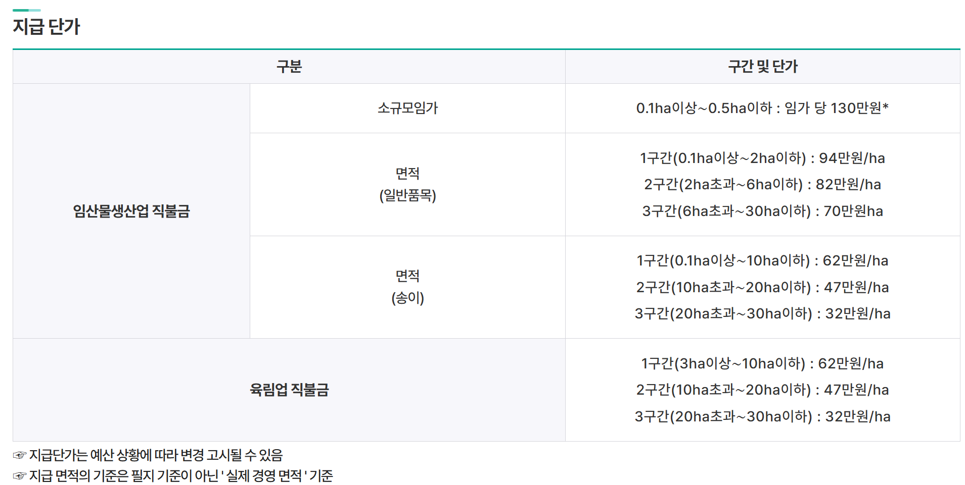 아래 임업직불금의 지급 면적 및 지급 단가를 확인해 보시기 바랍니다.